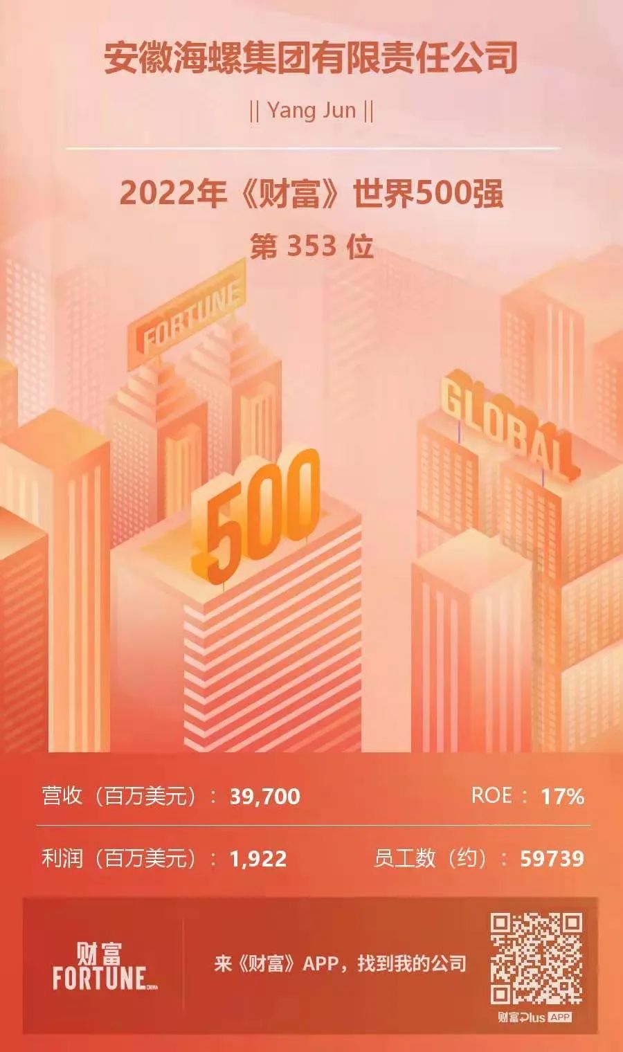 2022年8月3日,《财富》杂志公布“2022年世界500强企业”排名榜单,海螺集团以39,700百万美元的营业收入位居第353位,连续4年进入世界500强。