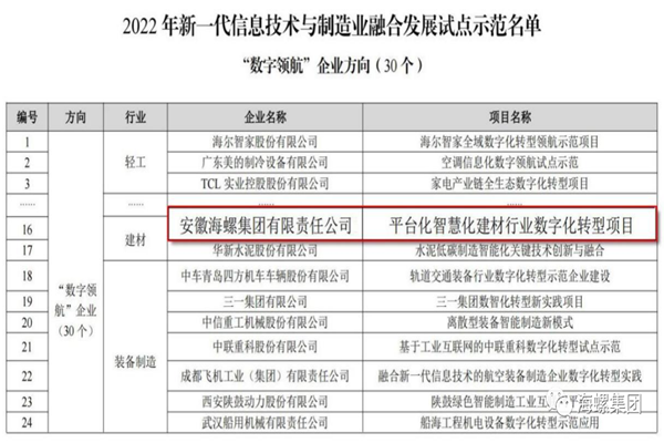 近日,工信部公布《2022年新一代信息技术与制造业融合发展试点示范名单》,对具有引领性的标杆示范企业予以表彰,安徽海螺集团成功入选全国首批“数字领航”企业。据悉,本次评选经企业自主申报、地方推进、专家评审等环节,共选出30家“数字领航”企业,涉及轻工、纺织、电子信息、钢铁、有色金属、石化化工、建材、装备制造、汽车共九大领域。