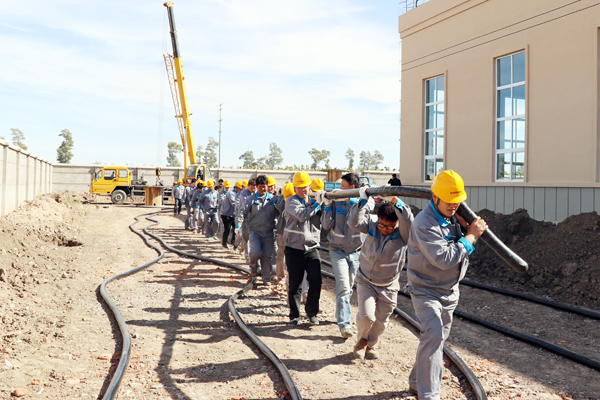 全体员工齐心协力放电缆