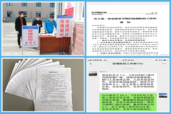 为加强节日疫情防控,保障节后复产复工,宝鸡公司严格落实宝鸡市和集团、股份公司防疫要求,制定下发《关于进一步加强春节期间疫情防控工作的通知》,与员工签订疫情防控承诺书,鼓励员工留在单位过春节,减少节日出行和聚集,具备疫情防控升级后本地人员开机复产的能力,同时成立春节防疫安全小组,每日掌握休假员工及第三方员工身体健康,出现异常第一时间报告。