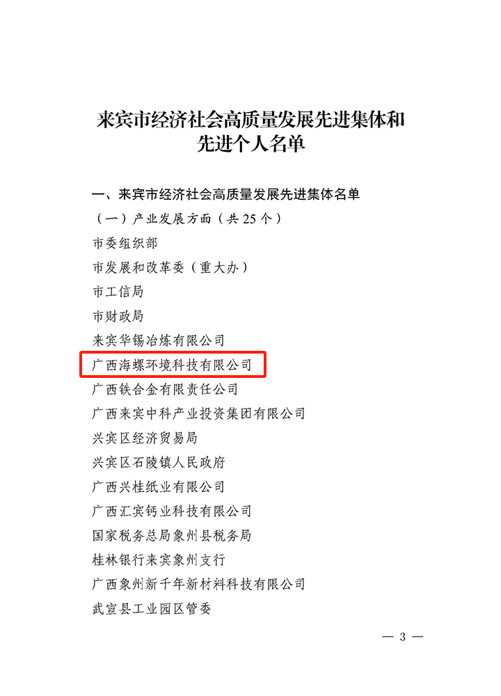2023年11月8日,广西来宾市委市政府发布关于表彰来宾市经济社会高质量发展先进集体先进个人的决定,海螺新材旗下广西海螺环境公司荣获“来宾市经济社会高质量发展先进集体”荣誉称号。