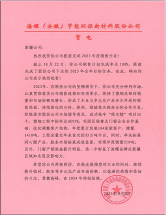 2023年,面对严峻的市场环境,新疆型材公司认真贯彻集团、新材股份公司决策部署,以“目标不变、任务不减、标准不降”为根本,立足市场需求实际,瞄准既定目标不动摇,以钉钉子精神抓部署、抓推进、抓落实,销量、销售收入、经营利润实现逆势平稳增长,年度4个大区、16个市场部中有3个大区及13个市场部提前完成年度计划任务,公司提前70天完成股份公司下达的销量计划任务。