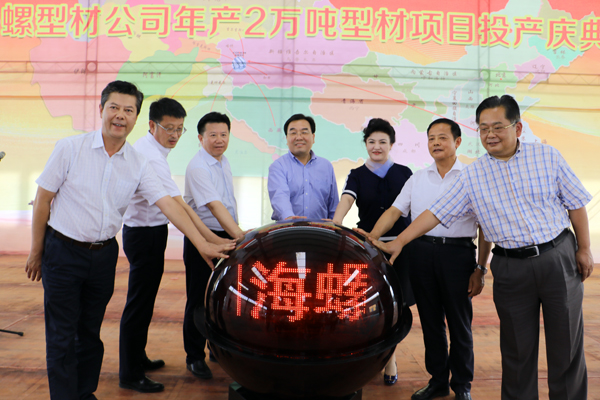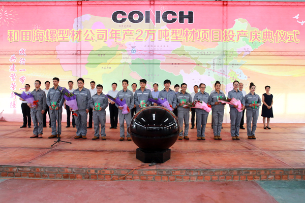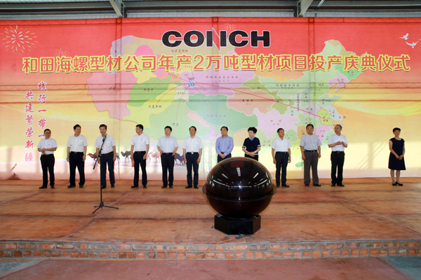 在热烈的掌声中,主持人隆重宣布和田海螺型材2万吨型材项目正式投产。随后,安徽省委副书记信长星,省委组织部副部长刘志宏,省发改委副主任曹发义,新疆维吾尔自治区交通运输厅党组副书记、厅长祖丽菲亚,和田地委副书记袁宝新,海螺集团总经理任勇,和田地委委员、皮山县委书记艾合买提·买买提等领导共同启动了项目投产激光水晶球。