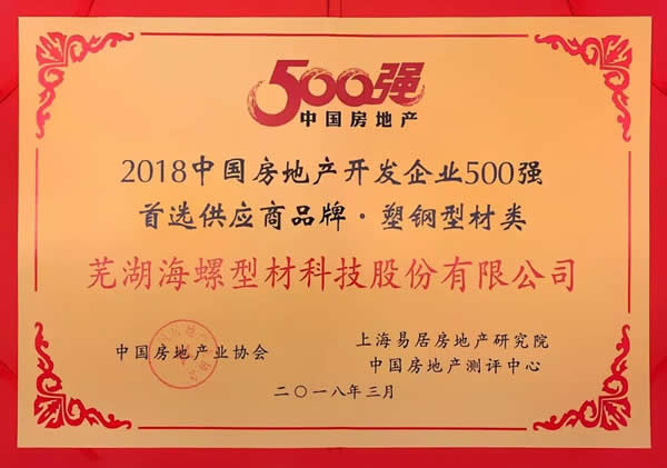 近日,2018中国房地产开发企业500强测评成果发布会在广州隆重举行,备受关注的"2018中国房地产开发企业500强"、"500强房企首选供应商服务商品牌"等系列测评榜单最终揭晓。海螺型材荣获2018中国房地产开发企业500强首选供应商品牌。