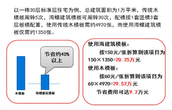 以一栋30层标准层住宅为例,总建筑面积为1万平米,传统木模板周转5次,海螺建筑模板可周转30次。