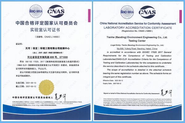 2021年5月27日,天河环境公司收到中国合格评定国家认可委员会颁发的CNAS实验室认可证书,正式获得CNAS实验室认可资质。