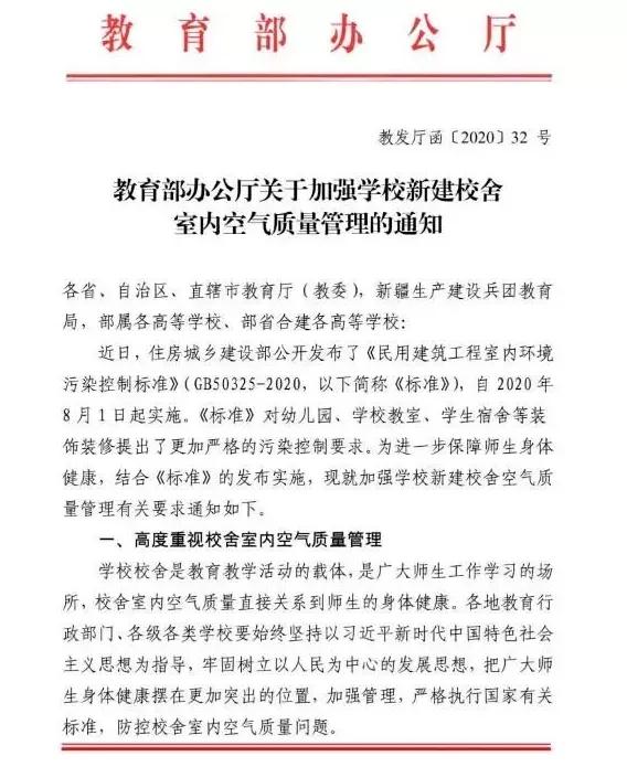 前期,教育部办公厅下发《关于加强学校新建校舍室内空气质量管理的通知》要求,自2020年8月1日起实施,对学校装饰装修提出了更加严格的污染控制要求。