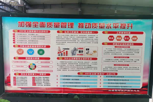 为认真开展全国第44个“质量月”活动,海螺型材各子公司紧紧围绕“深入实施质量提升行动,大力推进质量强国建设”活动主题,组织开展了质量承诺签名及宣誓、展板条幅宣传、质量事故案例学习、质量专项检查、市场调研等系列活动,进一步提升了全员质量意识,营造了浓厚的质量管理氛围。