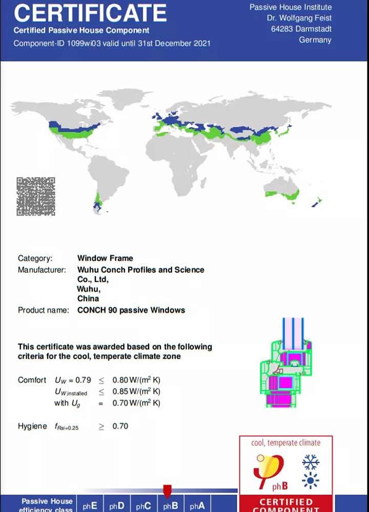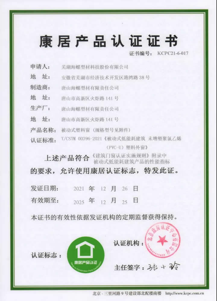 海螺型材积极参与地方建筑节能标准制定,同时加大系统门窗技术研发,被动窗产品在获得德国能源署被动门窗研究所颁发的PHI认证证书基础上,近日在国内又获得康居产品认证证书,加入了被动式低能耗建筑产业技术创新战略联盟,入选了被动式低能耗建筑产品选用目录,整窗传热系数K值≤0.80 W/(㎡·K),产品节能效果突出,适用于严寒、寒冷地区被动式超低能耗建筑。