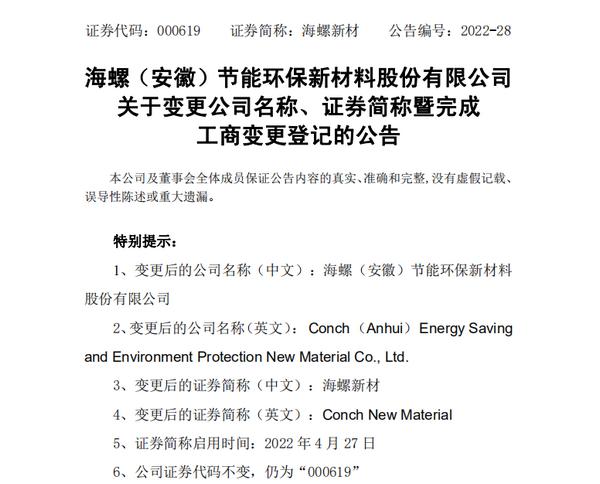 经工商行政部门审核登记和深圳证券交易所核准,4月27日,“芜湖海螺型材科技股份有限公司”公司名称正式变更为“海螺(安徽)节能环保新材料股份有限公司”,公司股票简称由“海螺型材”变更为“海螺新材”。变更后,公司名称与主营业务更相匹配,凸显公司产业节能环保属性,更加准确的诠释了公司未来发展方向,将有效提升公司品牌认知度和行业影响力。
