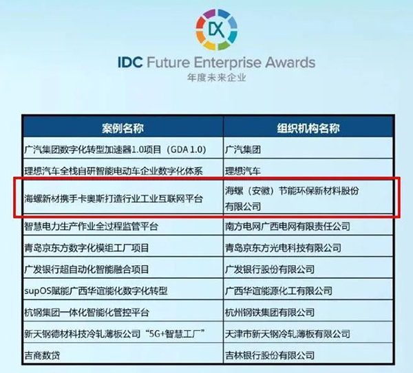 近日,IDC(国际权威研究机构)公布了第八届中国未来企业大奖评选结果,“海螺新材携手卡奥斯打造行业工业互联网平台”案例荣获“2023 IDC中国未来企业大奖优秀奖”。
