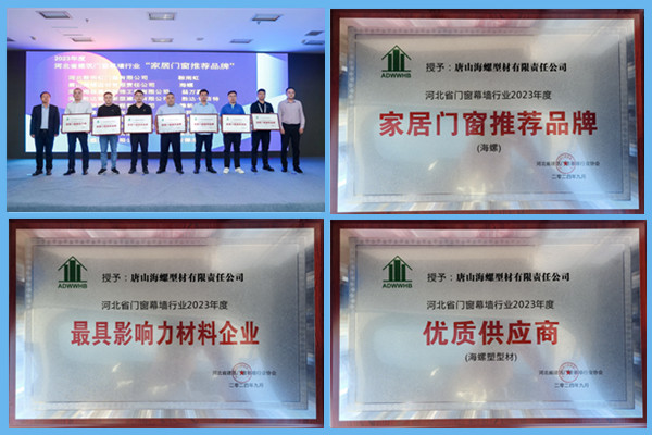 展会期间,公司参加了高性能新质UPVC门窗推广大会,现场展出产品以过硬的产品质量,公认的品牌形象,本着“至高品质,至诚服务”的宗旨,赢得了到访客商与行业同仁的一致好评,并荣获河北省建筑门窗幕墙协会颁发的2023年度“最具影响力材料企业”、“家居门窗推荐品牌”、“优质供应商”等荣誉称号。