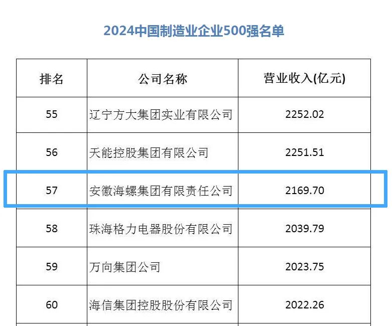 2024中国制造业企业500强入围门槛迈上新台阶,达到170.62亿元,较上年提升了5.12亿元;实现营业收入52.01万亿元,较上年增长1.86%。当前,海螺集团正在加快构建以水泥制造为基础,新能源、新材料、环保产业、数字经济、现代服务贸易五大产业相互促进的“一基五业”高质量发展新模式,将创新摆在发展全局的核心位置,坚持走“产业绿色化、工厂智能化、管理信息化、经营国际化”发展道路,推动企业高质量发展不断取得新成效。今年,海螺集团在2024年《财富》中国500强榜单中排名第135位,在中国企业联合会发布的2024中国企业500强榜单中排名第130位。
