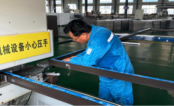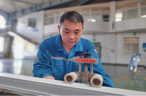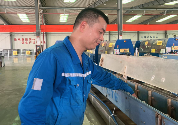 唐山型材公司挤出副操赵子彬正在调试嵌入式胶条装置