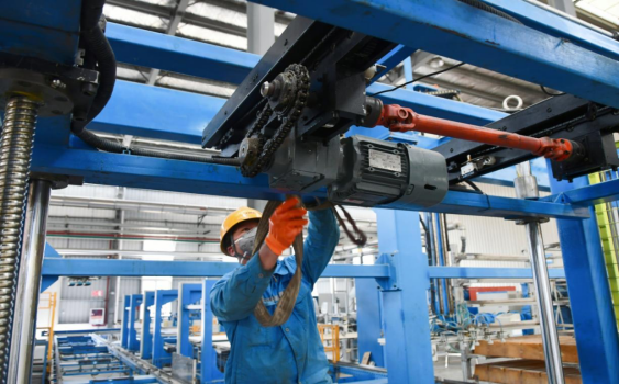 广西环境公司机电维修工谭启寻在检修挤出自动化拆垛设备