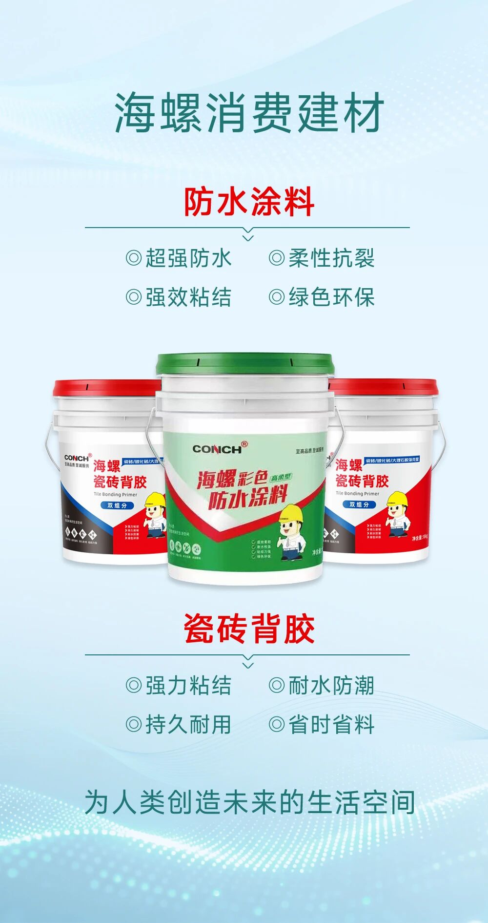 海螺消费建材打造全品类产品链全系产品质量优于国家标准海螺防水涂料超强防水、柔韧抗裂海螺瓷砖背胶强力粘接、持久耐候全方位适配各类家装、工装需求从装修源头夯实“好房子”安全护盾