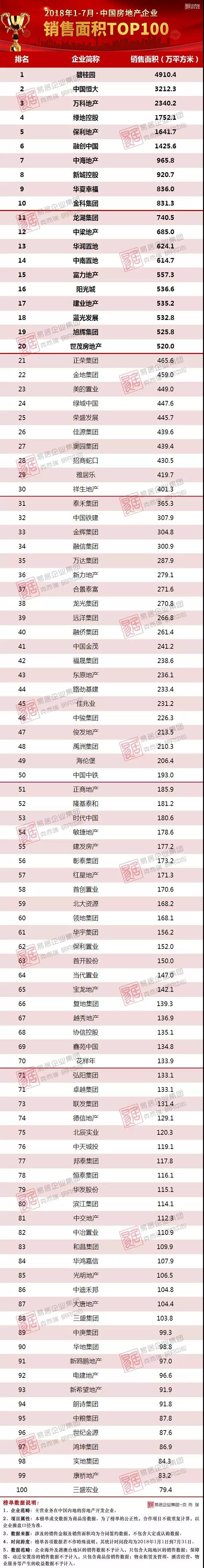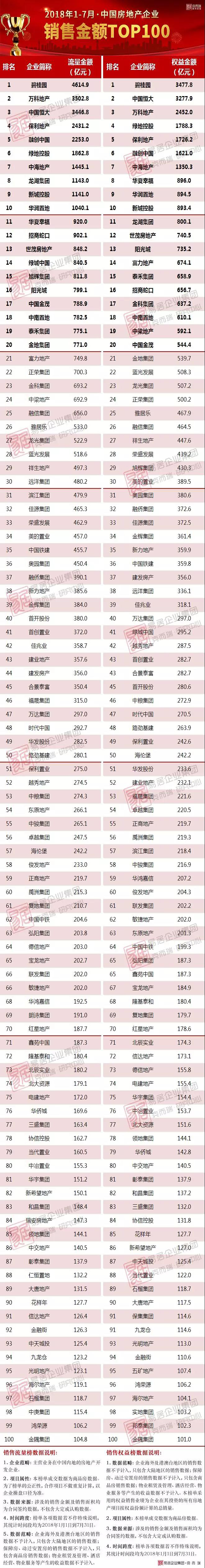 2018年7月,TOP100房企的销售由于季节性因素较6月份有所下滑。与6月单月超万亿的销售规模相比,百强房企7月的业绩环比下降31.5%。但与去年7月业绩陡降的情况不同的是,本月7642亿元的销售与1-6月均值基本持平。今年百强房企7月单月业绩的同比增幅达57.7%。