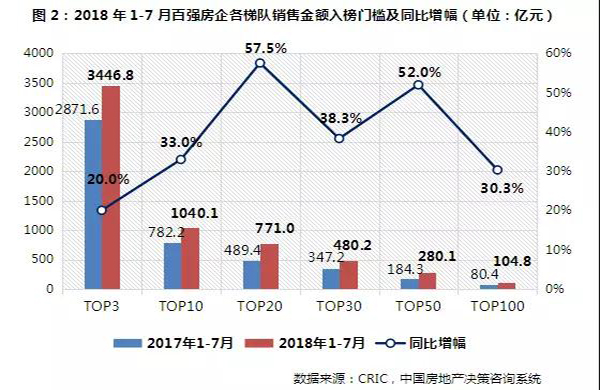 2018年1-7月,百强房企各梯队销售金额入榜门槛较去年同期均有所提升。其中,TOP20房企门槛提升幅度最大,较2017年同期增长近6成。TOP30和TOP50房企门槛的同比增幅也分别达到了38.3%和52%,规模竞争加剧。值得注意的是,截止7月末TOP10房企门槛已超千亿,达到1040.1亿元。
