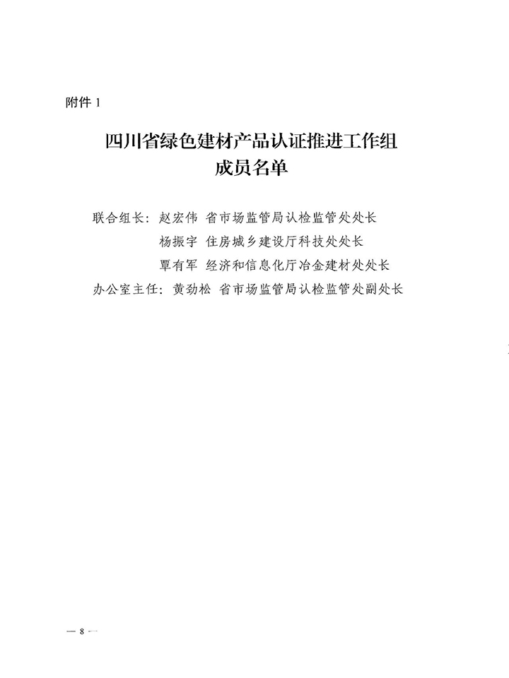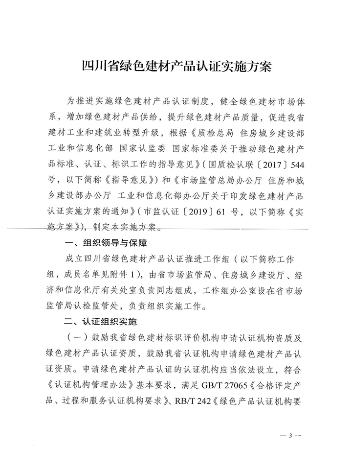 为贯彻落实《市场监管总局办公厅 住房和城乡建设部办公厅 工业和信息化部办公厅关于印发绿色建材产品认证实施方案的通知》(市监认证[2019]61号)要求,省市场监管局、住房城乡建设厅、经济和信息化厅联合制定了《四川省绿色建材产品认证实施方案》。现印发你们,请结合本地区实际认真组织实施。