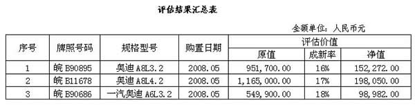 3、本次评估对象及范围为:芜湖海螺型材科技股份有限公司持有车牌号为皖B90895/皖B11678/皖B90686的车辆(车辆型号分别为奥迪A8L3.2、奥迪A8L4.2、一汽奥迪A6L3.2)。